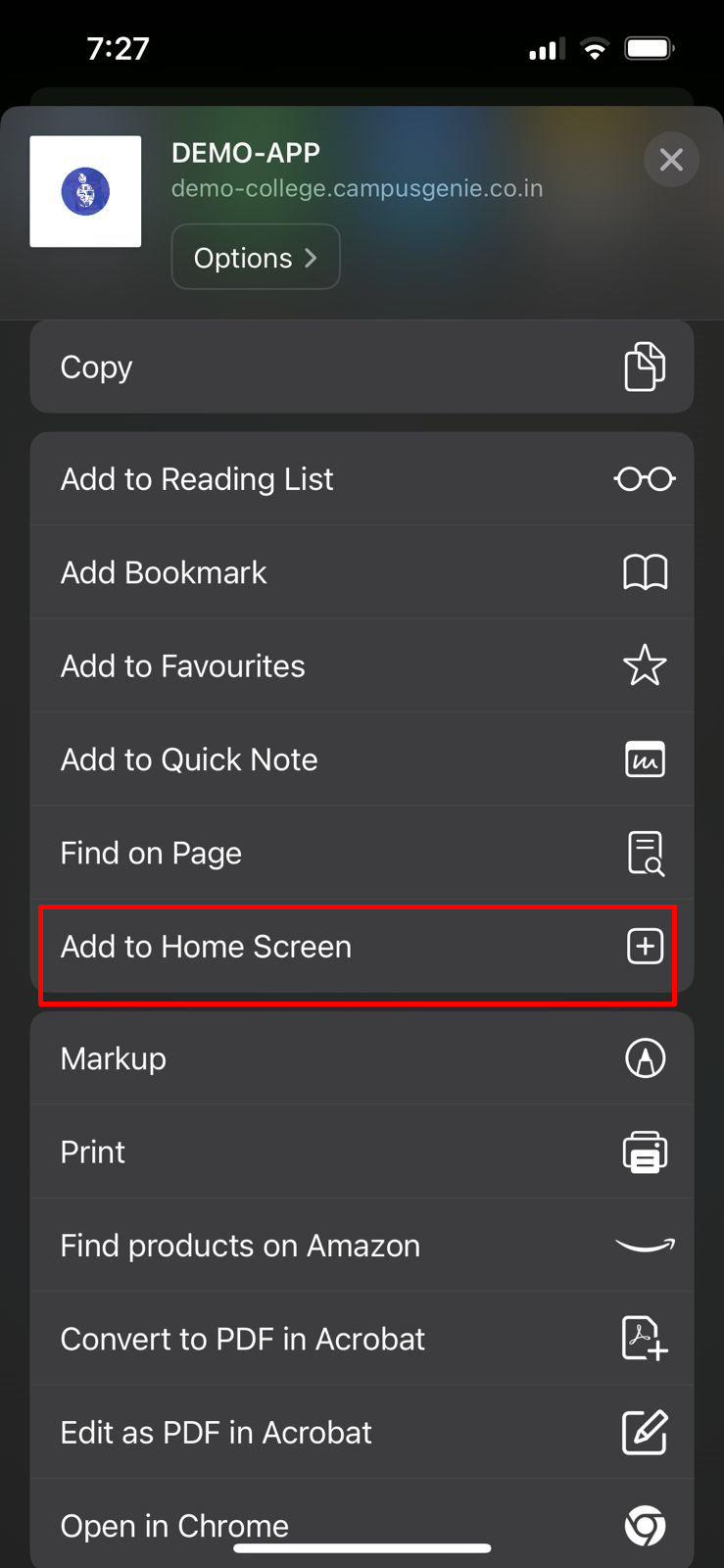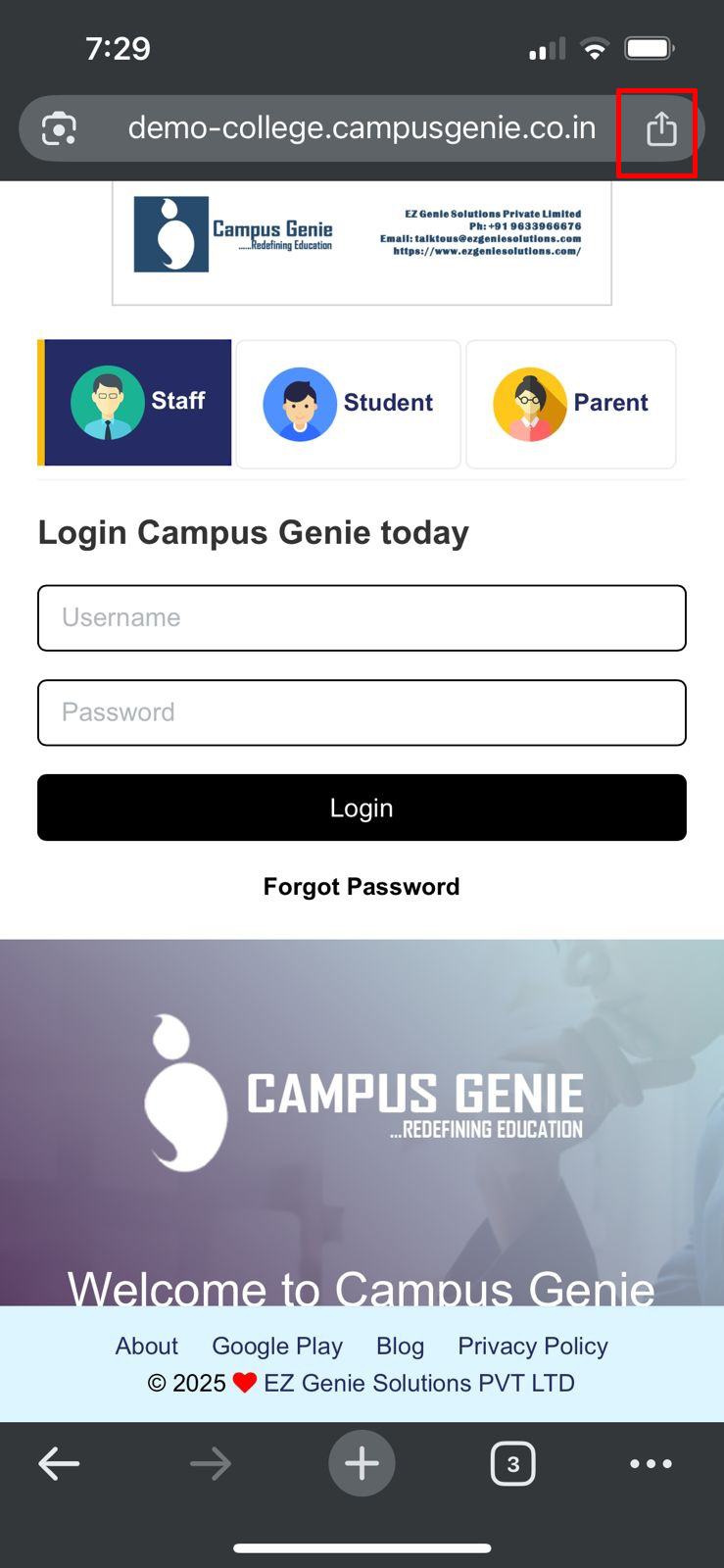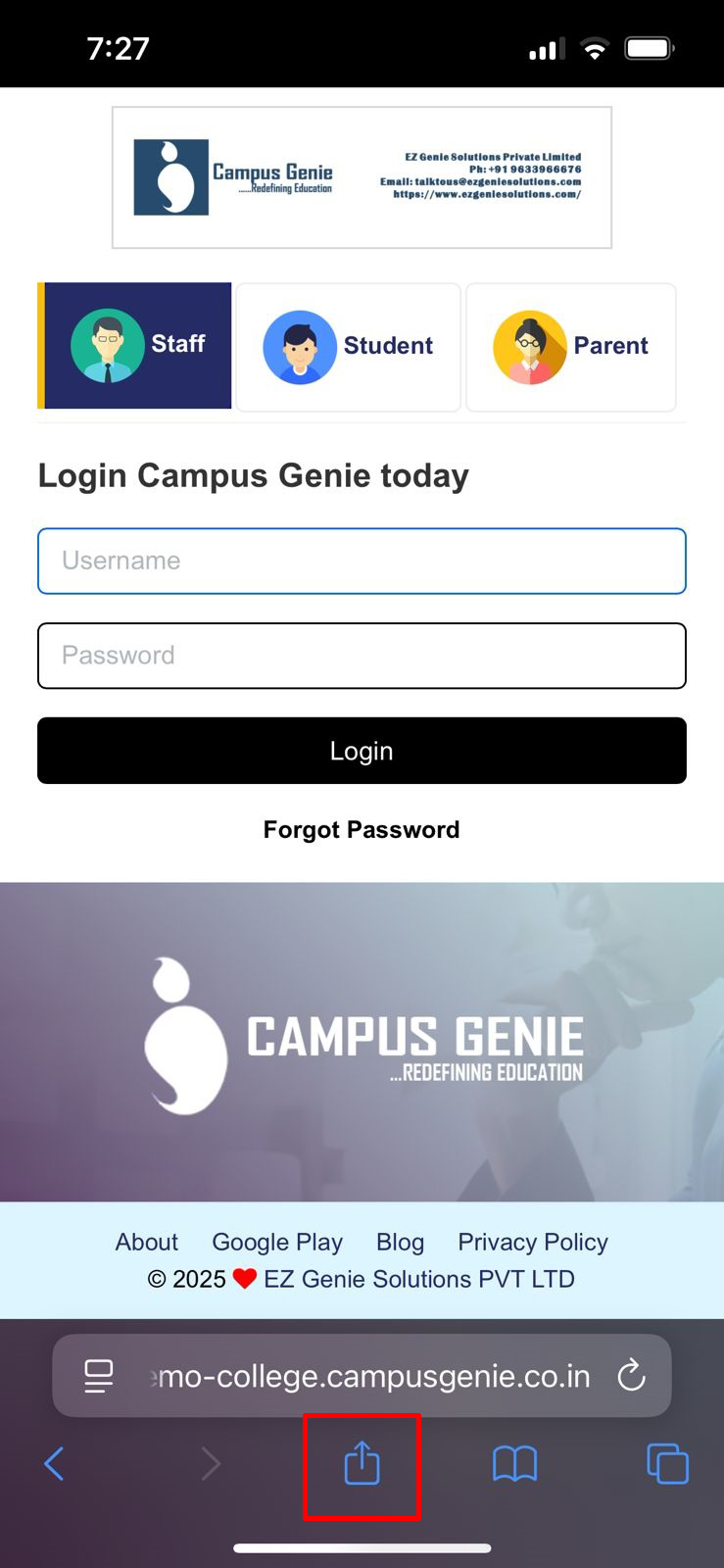 Safari browser on your mobile and type your campus url (https://bjcsi.campusgenie.co.in) in the search bar, and click on the share icon